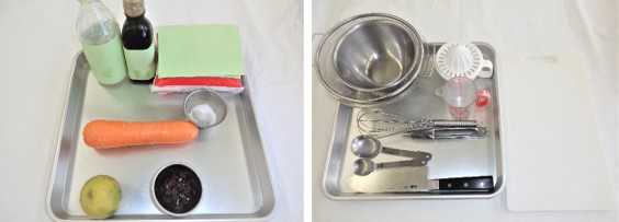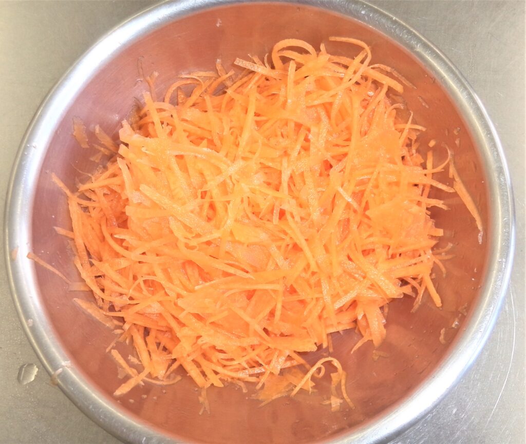 ①人参は細いせん切りにして塩(人参用)をかけて10分程度おく。