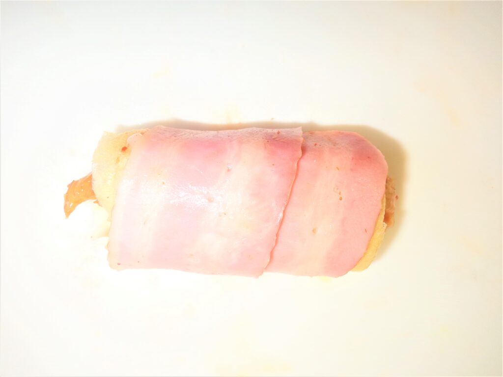 ⑤くるくる端から巻き、ベーコン1枚を斜めに巻く。