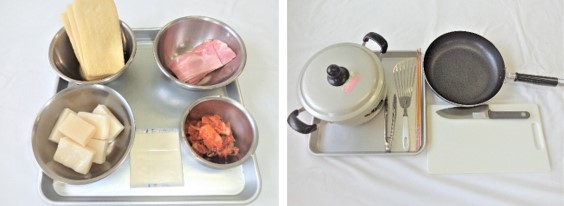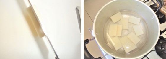 ②もち1枚は厚みを半分に切り、熱湯に浸し柔らかくする。
