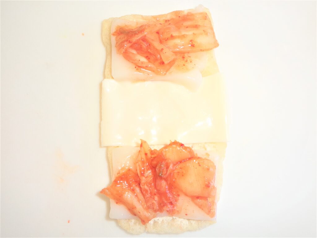 ④真ん中にスライス1/2枚をのせる。おもちの上下にキムチ適量をおく。