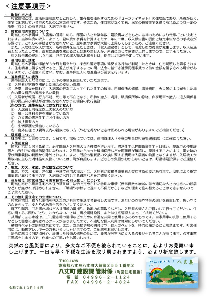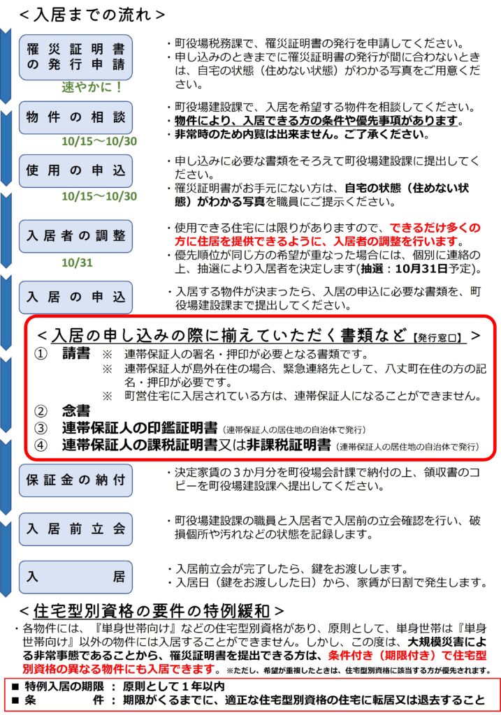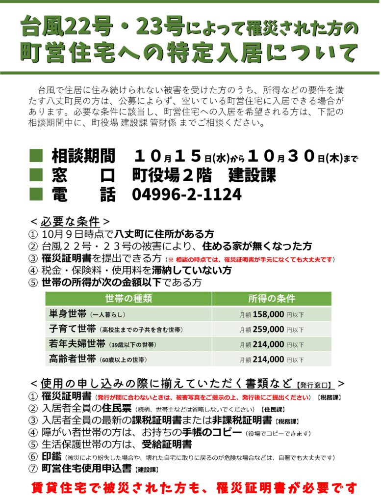 台風で住居に住み続けられない被害を受けた方のうち、所得などの要件を満たす八丈町民の方は、公募によらず、空いている町営住宅に入居できる場合があります。