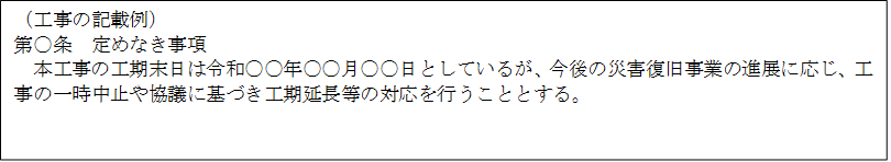 既に発注した工事等については、現場の被災状況等の確認や請負者の意向確認を行い、必要があれば工事等の一時中止や工期延長等の柔軟な対応を行うものとします。
