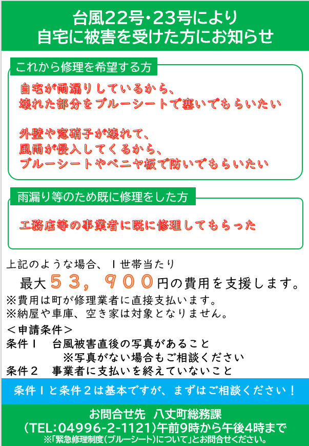 台風22号・23号により、自宅に被害を受けた方にお知らせ