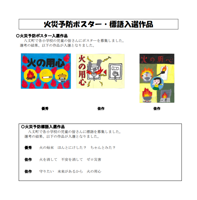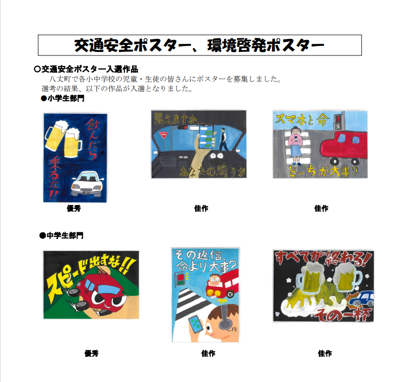 交通安全ポスター、環境啓発ポスター、火災予防ポスター・標語入選作品 八丈町で各小学校の児童の皆さんにポスター・標語を募集しました。選考の結果、以下の作品が入選となりました。 たくさんのご応募ありがとうございました たくさんのご応募ありがとうございました。