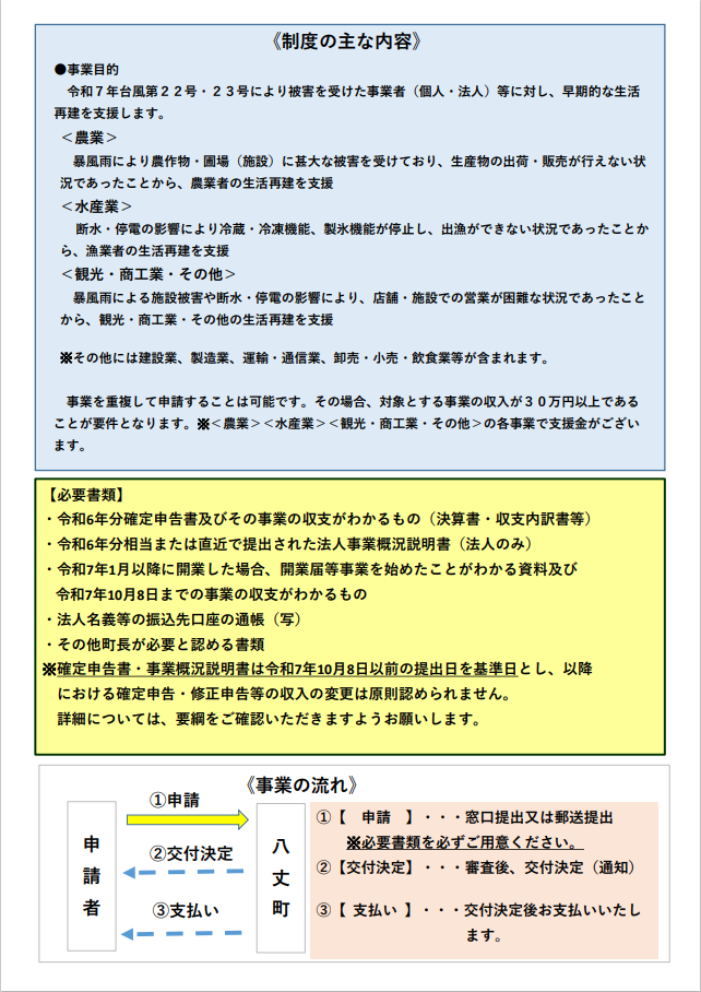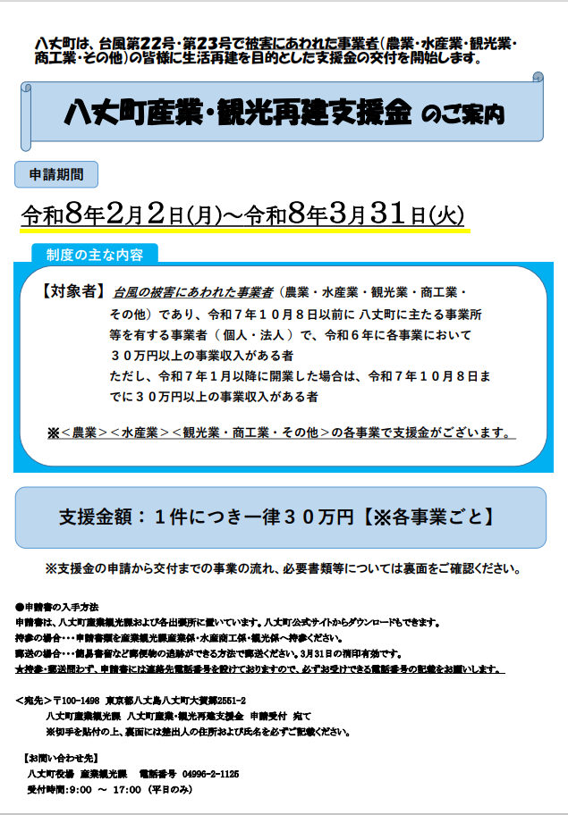 【対象者】台風の被害にあわれた事業者(農業・水産業・観光業・商工業・その他)であり、令和7年10月8日以前に 八丈町に主たる事業所等を有する事業者( 個人・法人 で、令和6年に各事業において30万円以上の事業収入がある者