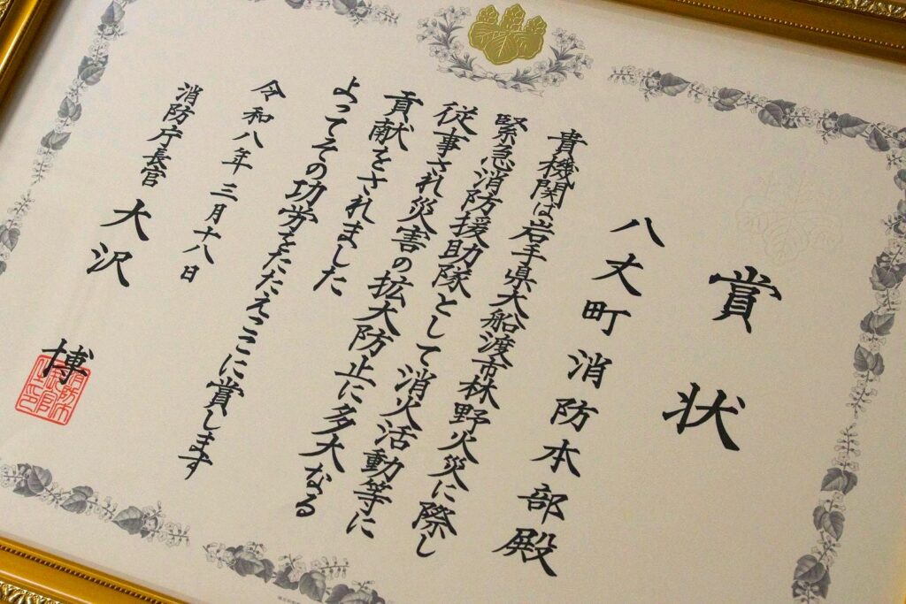 昨年2月25日に岩手県大船渡市で発生した林野火災において、緊急消防援助隊として出動した八丈町消防本部がその活動功績により消防庁長官より賞状および緊急消防援助隊活動章を授与されました。