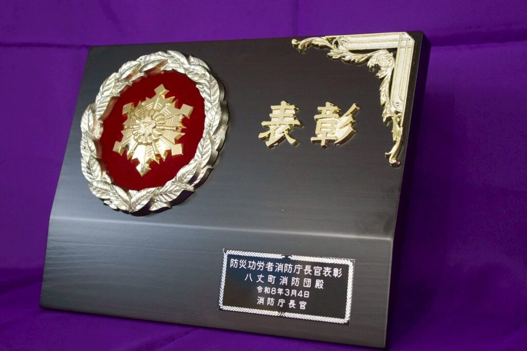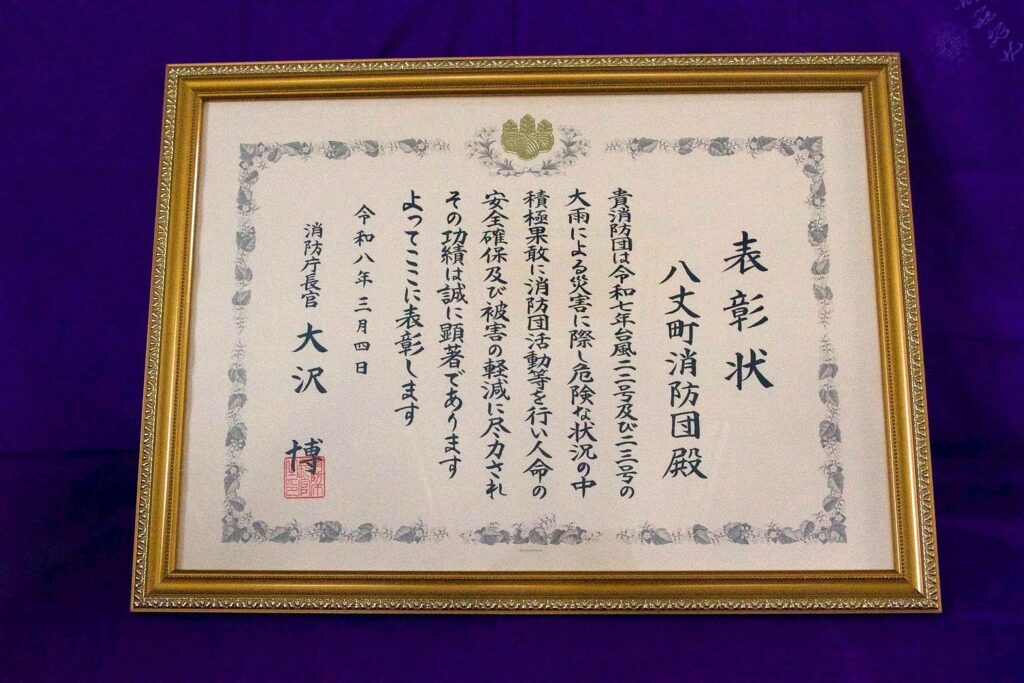 また、台風22号・23号による大雨災害に際し、危険な状況下において消防団活動に尽力した功績により、八丈町消防団が消防庁長官より表彰状と盾を授与されました。