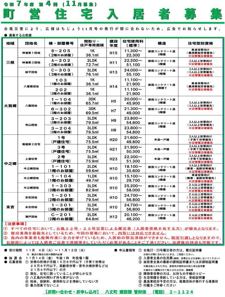 令和7年度第4回(11月)町営住宅入居者募集